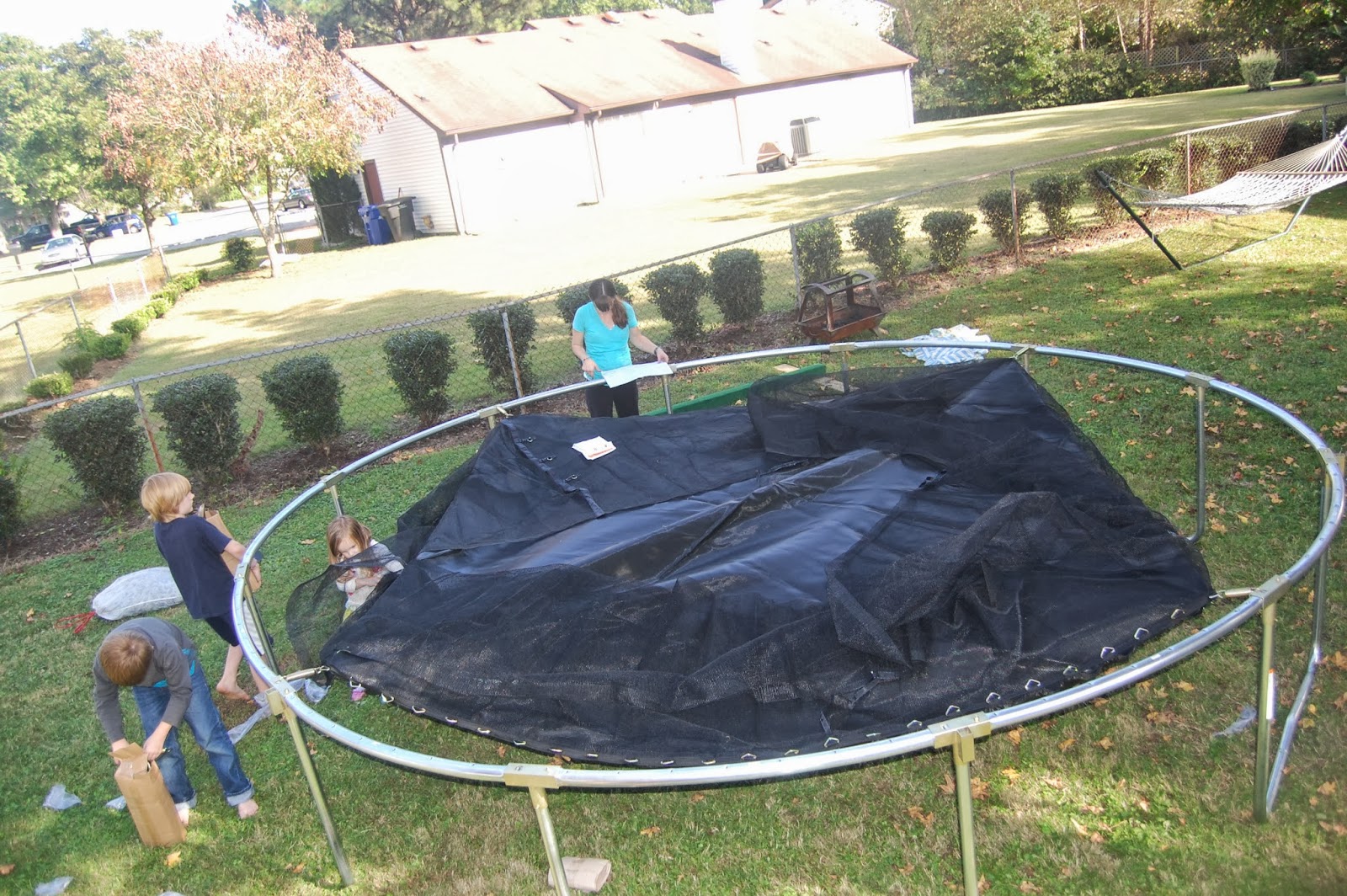 I had planned to let the hubby put the trampoline together over the weekend, but since I have no resolve, I ended up putting it together Friday afternoon (with the help of the boys, of course).